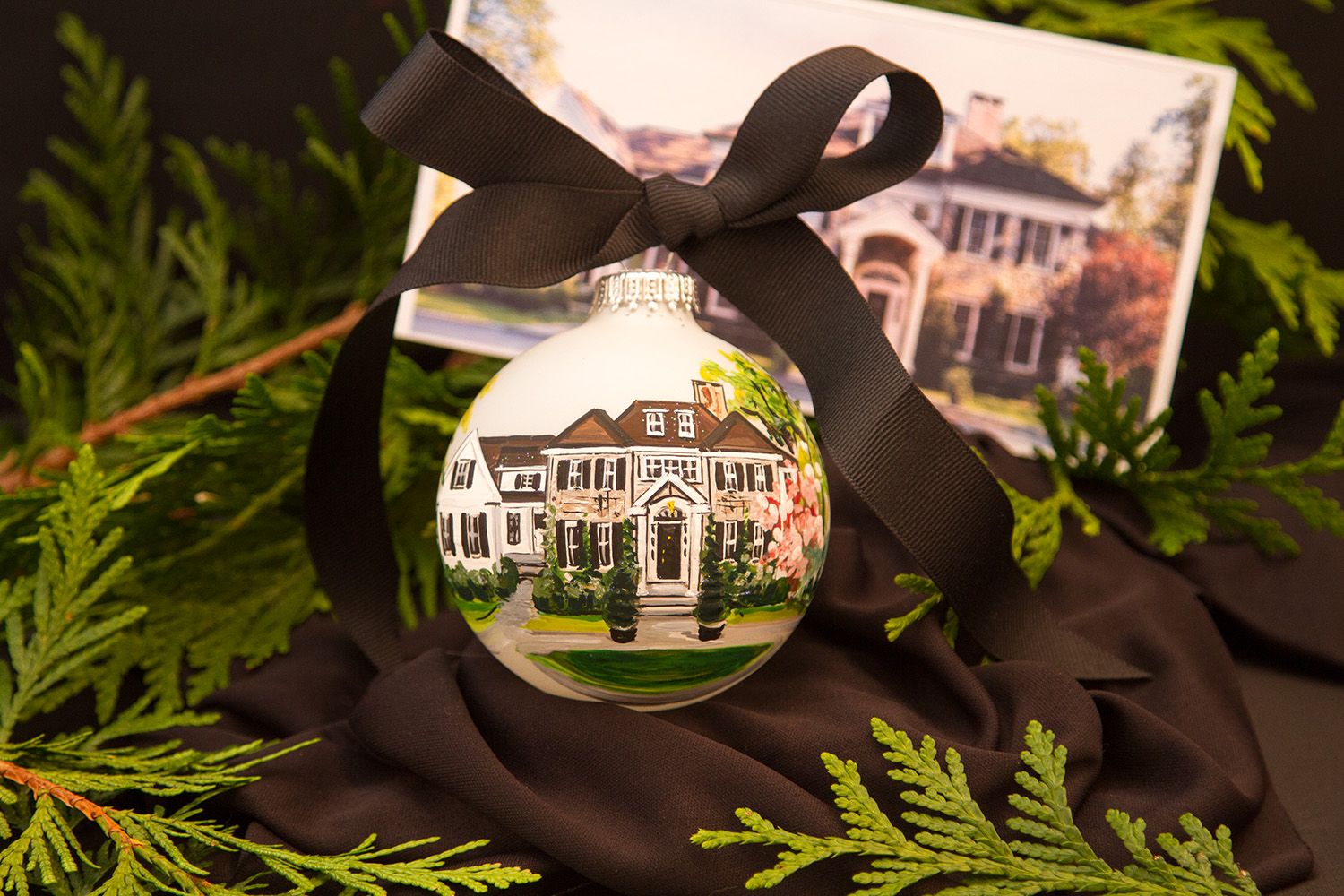 A home d elicately hand painted on a frosted glass 3 1/4" ornament, by Seton